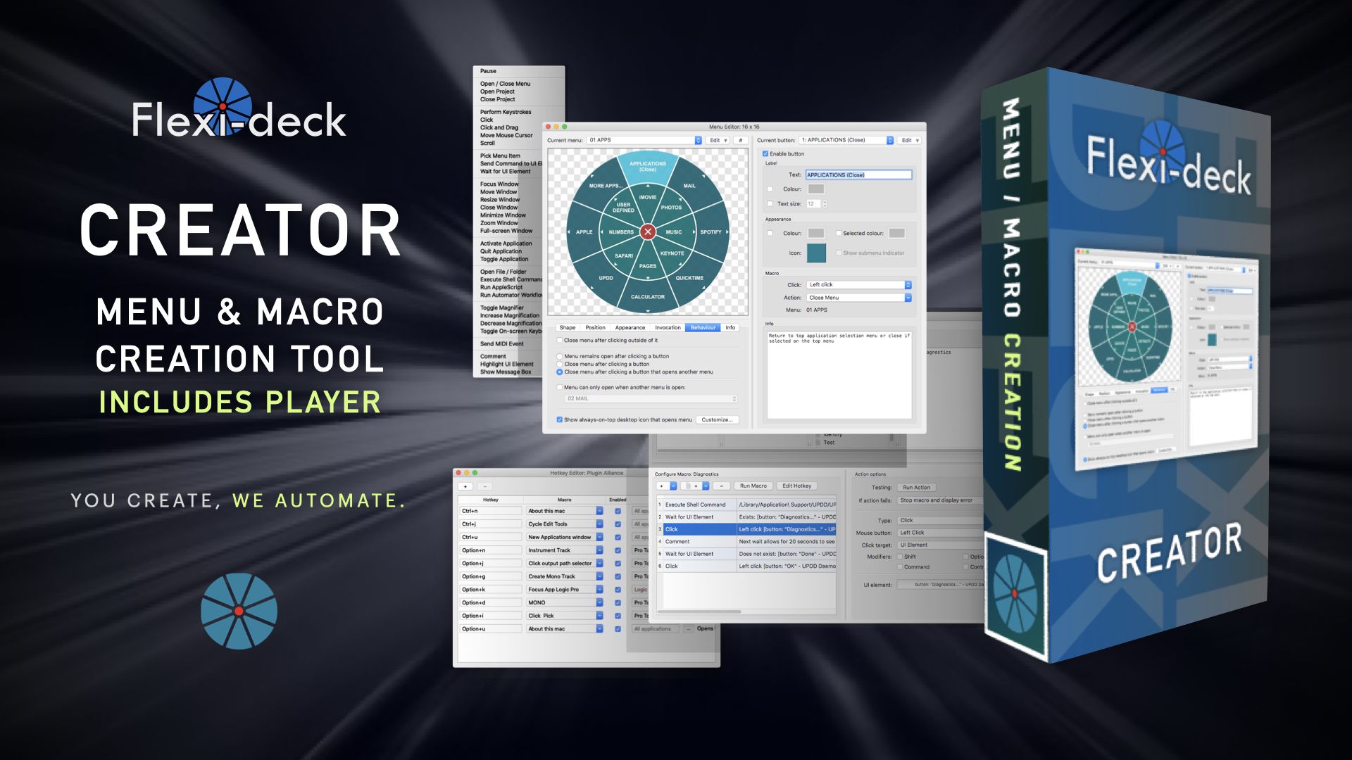 The following videos show the basic concepts of using the Flexi-deck editors to create the macros and menu in a simple automation task along with a macro sequence used to perform a complex sequence in the Logic Pro audio application.