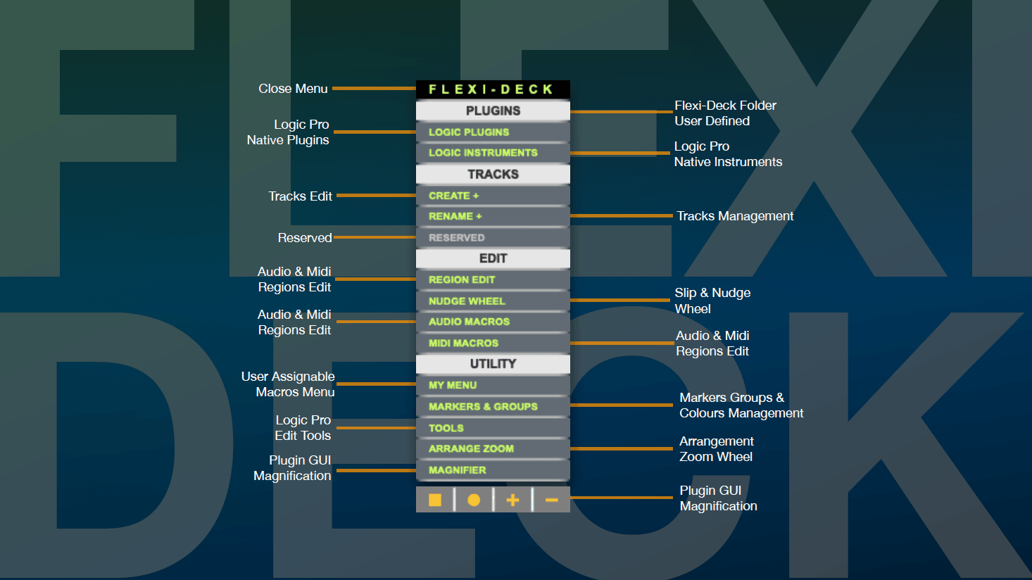 This entry level library is offered for free to allow you to become familiar with the power and usefulness of Flexi-deck automation used to control certain aspects of the Logic interface.