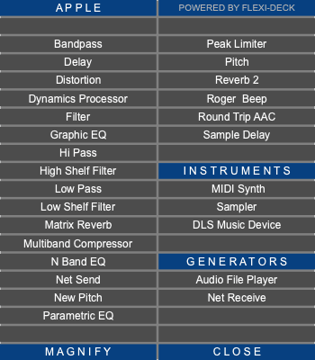 Quick and easy access to the System Plugins supplied by Apple including Distortion, Graphic Equaliser & Reverb.
